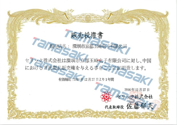 深圳市京都玉崎電子有限公司在全體員工不斷的努力下,2016年12月新增加了日本代理品牌,成功取得日本SOLAX/SERIC索萊克代理證書,中國國內(nèi)注冊(cè)商標(biāo):XELIOS索萊克